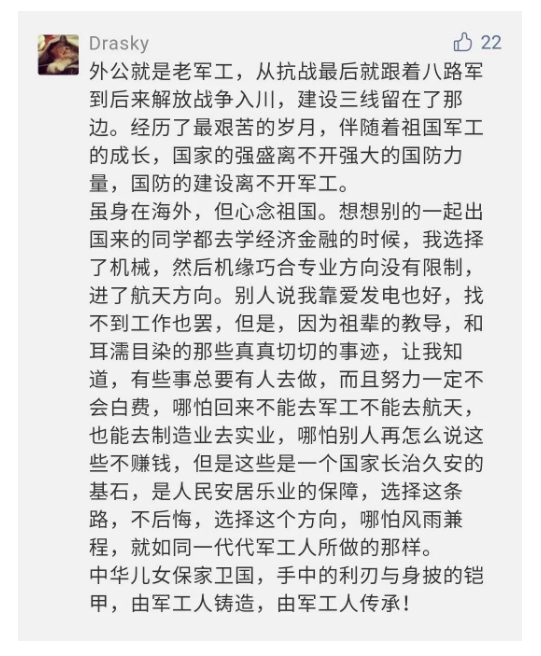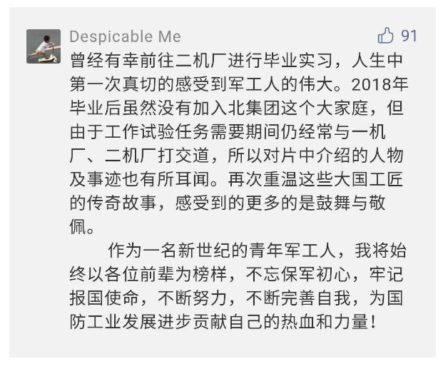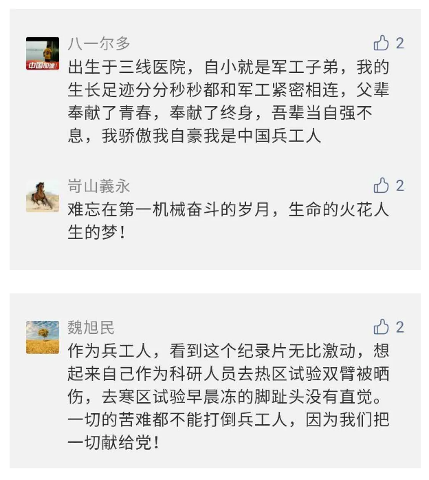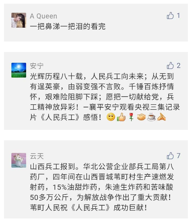 在中國共產(chǎn)黨成立九十九周年之際,由中國兵器工業(yè)集團有限公司組織攝制、反映人民兵工在黨的領(lǐng)導(dǎo)下80余年光輝奮斗歷程、廣大兵工人弘揚“把一切獻給黨”人民兵工精神的三集紀錄片《人民兵工》自7月1日-3日每晚20點在中央廣播電視總臺中文國際頻道(CCTV-4)《國家記憶》首播以來,在兵器系統(tǒng)和觀眾中引發(fā)強烈反響,很多網(wǎng)友、觀眾紛紛留言表達了自己的觀后感受。 觀眾在兵器工業(yè)集團官微的留言區(qū)直抒了觀影感受,有的熱淚盈眶,有的心潮起伏,有的興起賦詩,有的認為讓心靈得到凈化、思想得以提升,有的認為是最直觀的國防教育教材...... 影片勾起了退休老同志無限懷念、兵工人的甜美記憶、攝制期間官田中央兵工廠文化教育基地工作人員的難忘瞬間...... 相比老一輩,年a輕的兵工人也表達了傳承紅色基因,弘揚新時代“把一切獻給黨”的人民兵工精神的豪邁氣概...... 其中也不乏在校的學(xué)生,在感謝英模樹立的榜樣和豐碑的同時,也為自己的職業(yè)生涯定好坐標、做好規(guī)劃,努力前行...... 作為新時代弘揚人民兵工精神的特色文化成果,紀錄片的播出,凝聚起廣大兵器干部職工團結(jié)奮斗新時代磅礴力量,極大的增強了兵工人的自豪感,大家紛紛表達了作為軍工央企一員 “此生無悔入軍工”的使命擔當...... 《人民兵工》共分為三集,分別是《搖籃》《錘煉》《前行》,全景式展示了我們黨領(lǐng)導(dǎo)和創(chuàng)建的第一個軍事工業(yè)部門——人民兵工80余年來從無到有、從小到大、從弱到強的光輝奮斗歷程,生動講述了廣大兵工人聽黨話、跟黨走,大力弘揚“把一切獻給黨”的人民兵工精神,自力更生、艱苦奮斗、開拓進取、無私奉獻的家國情懷和感人事跡。在人民兵工80余年篳路藍縷的奮斗歷程中,涌現(xiàn)出吳運鐸、倪志福、祝榆生等一大批英模人物,在血與火的考驗中凝練形成了“把一切獻給黨”的人民兵工精神,成為人民兵工奮斗不息的紅色基因。(王珊) |