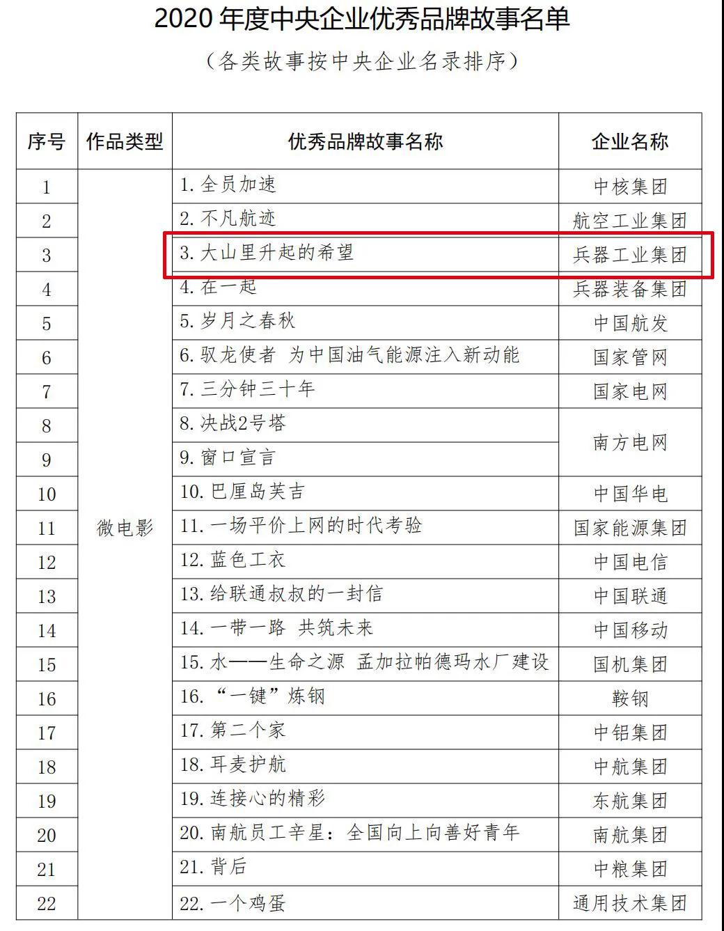 兵器工業集團品牌建設案例入選2020年度100個國有企業品牌建設典型案例和100個優秀品牌故事 |
