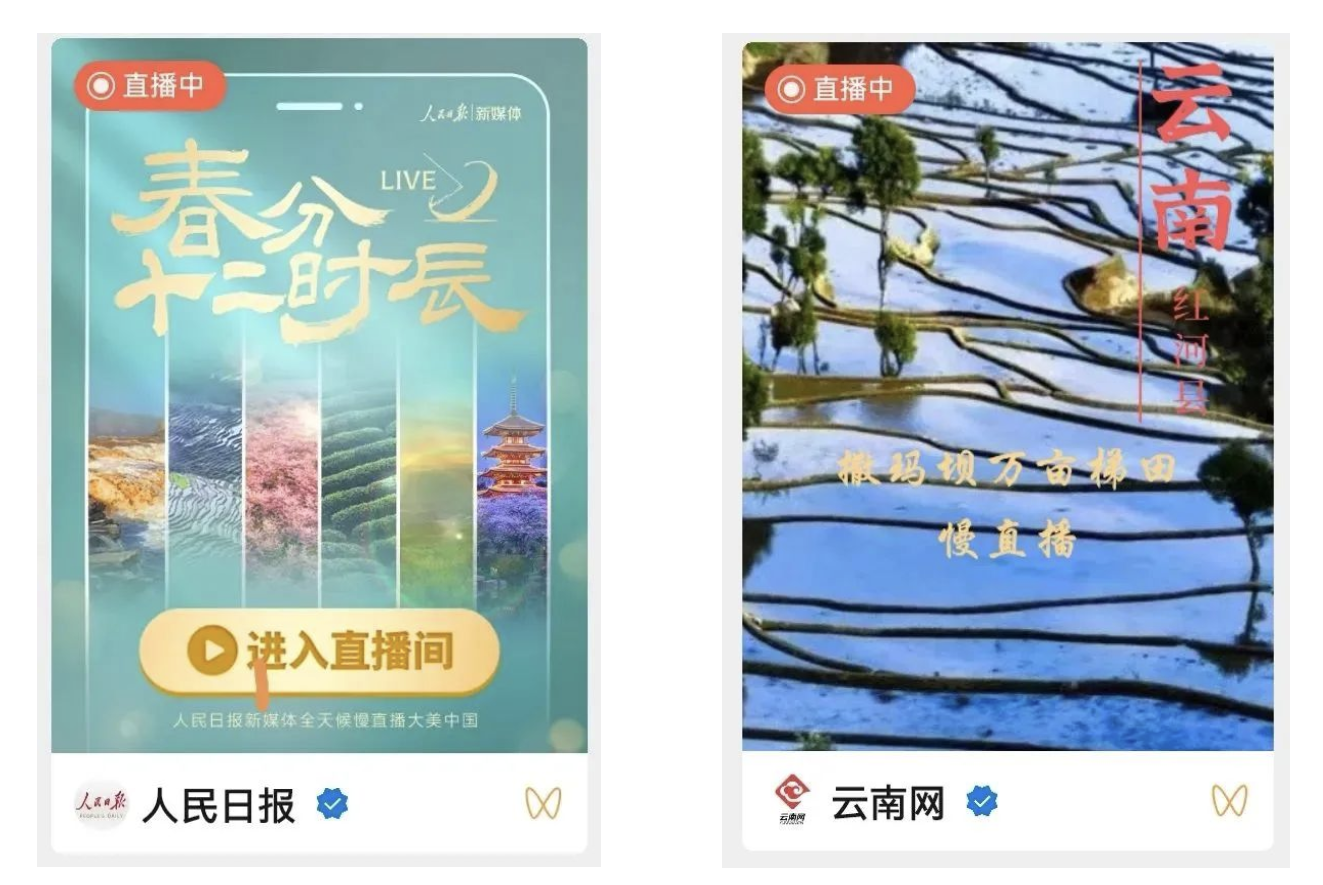 3月20日為農歷二十四節氣的春分,在中國兵器工業集團有限公司的助力下,人民日報、云南網等主流媒體再次聚焦紅河縣撒瑪壩萬畝梯田,人民日報新媒體平臺策劃推出“春分十二時辰”直播活動,通過鏡頭展示祖國各地春分時節壯美的自然風光。其中,人民日報視頻號和云南網視頻號在中午時段的直播中,紅河縣撒瑪壩萬畝梯田出現在觀眾的視野里,贏得了數十萬觀眾的點贊,產生了良好的社會效應。