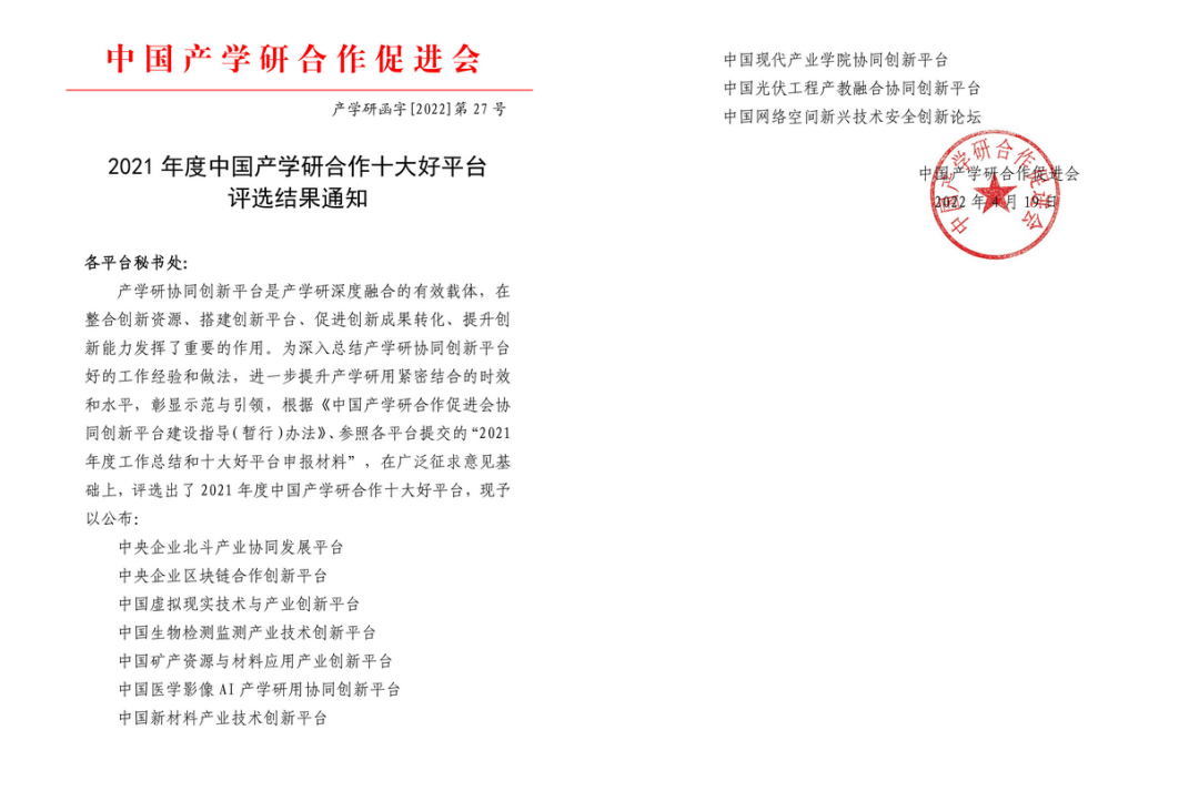 據(jù)了解,中國產(chǎn)學研合作促進會是經(jīng)國務院批準,由國家發(fā)展改革委、教育部、科技部、工業(yè)和信息化部、生態(tài)環(huán)境部、國務院國資委、國家知識產(chǎn)權(quán)局、中國科協(xié)、中國科學院、中國工程院、中華全國總工會、國家自然科學基金委、國家開發(fā)銀行等相關(guān)部門和一批高校、科研院所、央企、國企、民企等政產(chǎn)學研界共同參與創(chuàng)辦的全國性社會團體。此次入選“中國產(chǎn)學研合作十大好平臺”的各產(chǎn)學研協(xié)同創(chuàng)新平臺在整合創(chuàng)新資源、搭建創(chuàng)新平臺、促進創(chuàng)新成果轉(zhuǎn)化、提升創(chuàng)新能力方面發(fā)揮了重要作用。