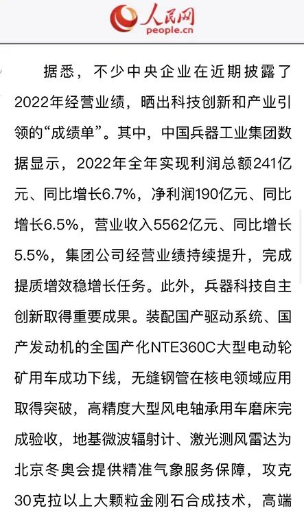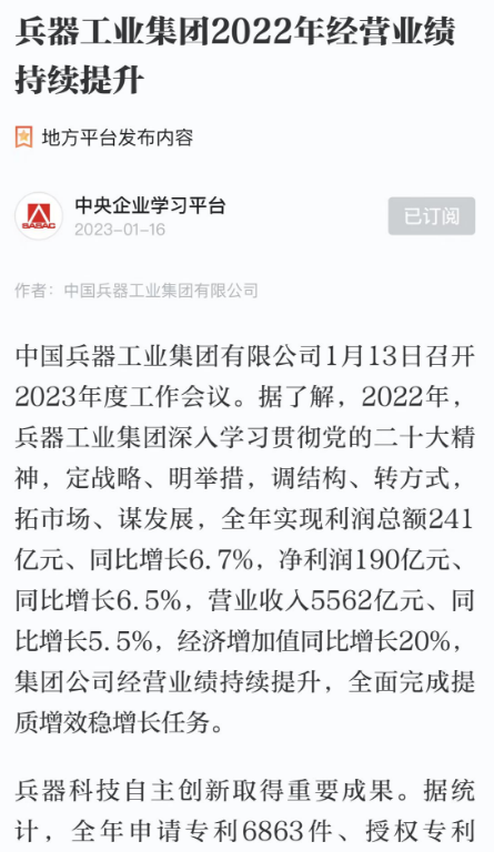 中國新聞網:2022年兵器工業集團實現利潤總額241億元 同比增長6.7%