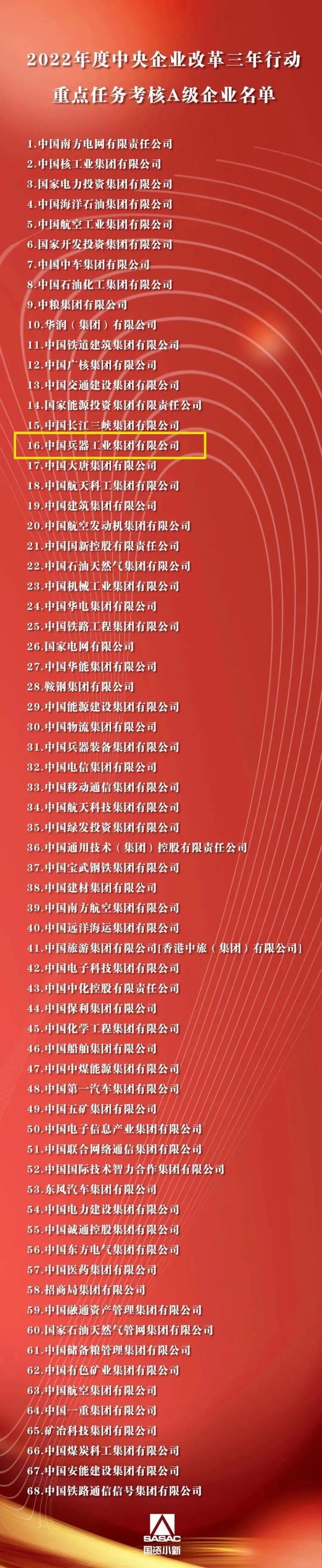 根據(jù)《中央企業(yè)改革三年行動(dòng)重點(diǎn)任務(wù)考核實(shí)施方案(試行)》和《中央企業(yè)改革三年行動(dòng)重點(diǎn)任務(wù)考核指標(biāo)表(2022版)》,經(jīng)審定,國務(wù)院國資委發(fā)布2022年度中央企業(yè)改革三年行動(dòng)重點(diǎn)任務(wù)考核A級(jí)企業(yè)名單,中國兵器工業(yè)集團(tuán)有限公司獲評(píng)A級(jí)。 來源/國資委網(wǎng)站 |