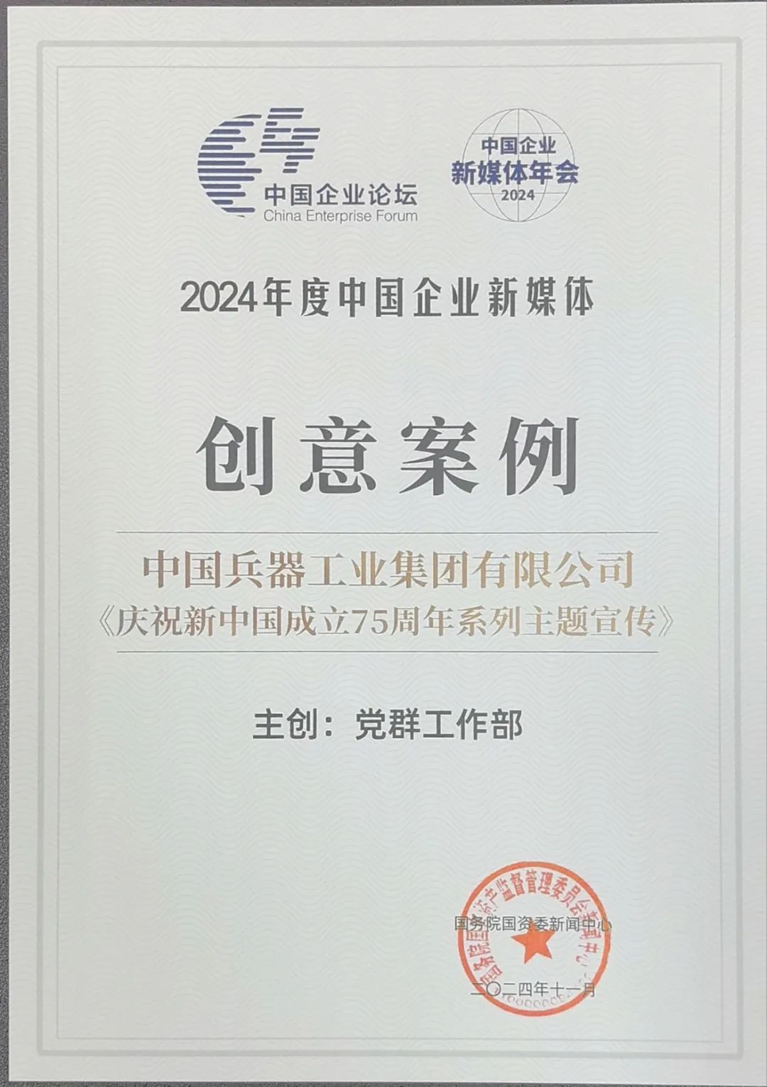 中國(guó)企業(yè)新媒體年會(huì)現(xiàn)場(chǎng)發(fā)布了“2024年度中國(guó)企業(yè)新媒體創(chuàng)新獎(jiǎng)、創(chuàng)意獎(jiǎng)、創(chuàng)作獎(jiǎng)”,其中,集團(tuán)公司《慶祝新中國(guó)成立75周年系列主題宣傳》榮獲2024年度中國(guó)企業(yè)新媒體創(chuàng)意案例。