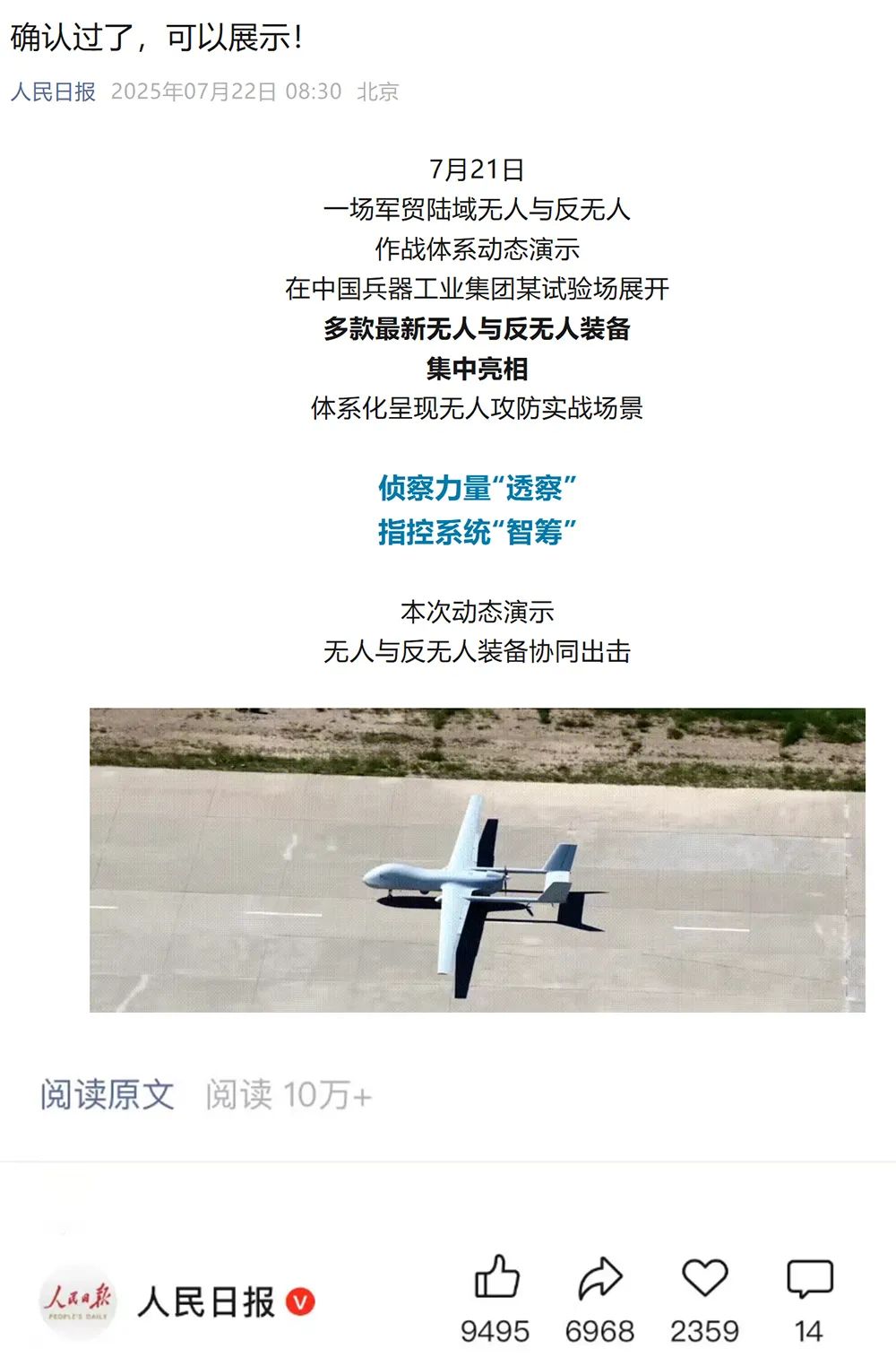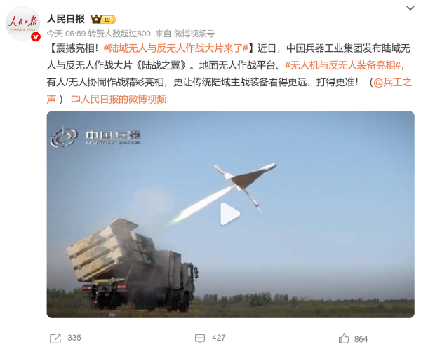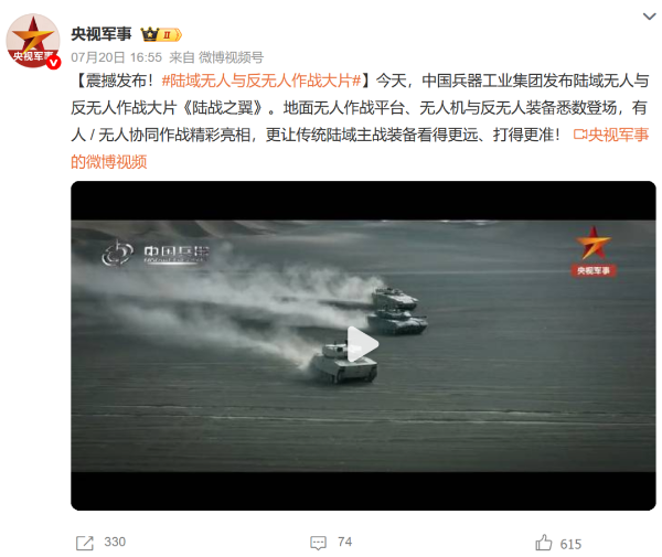 人民日報微博、央視軍事微博、央視新聞客戶端、中國新聞網、中新社國是直通車抖音、環球網微博、環球時報(X平臺、英文版客戶端)、中國日報網、央視軍事報道微博、中國軍號微博、中央廣播電視總臺“空天逐夢”微信視頻號、共青團中央B站、國資小新微博等中央主流媒體、國家部委的新媒體播發集團公司陸域無人與反無人作戰大片等視頻作品。