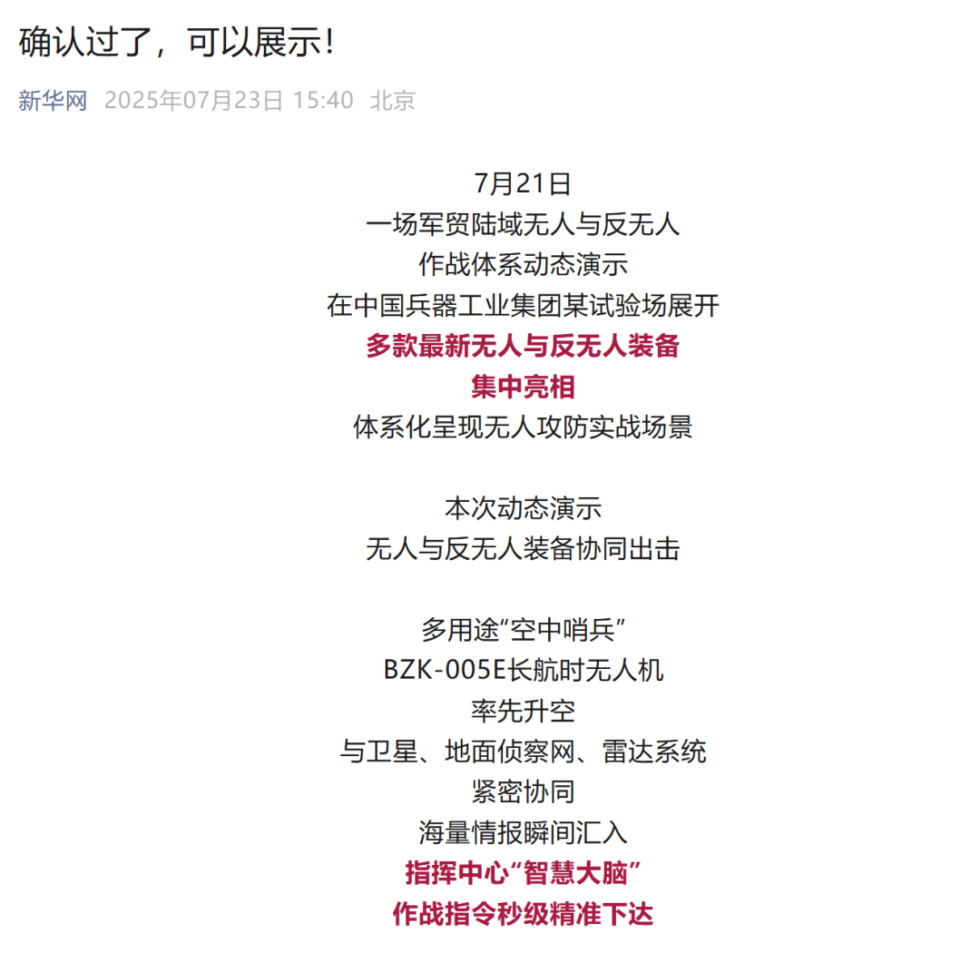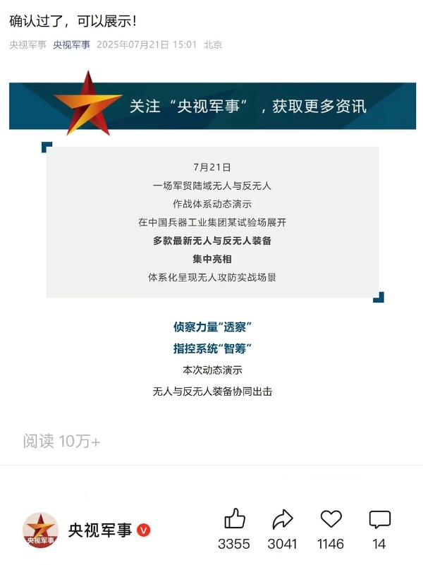 央視新聞客戶端:兵器工業集團陸域無人與反無人作戰體系震撼來襲!搶先看!2025-07-24